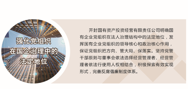 開封國投在市委市政府、市財政局的正確領導下,充分發(fā)揮領導作用,把方向、管大局、保落實,依照規(guī)定討論和決定公司重大事項。以促進公司經(jīng)營發(fā)展為中心,不斷加...